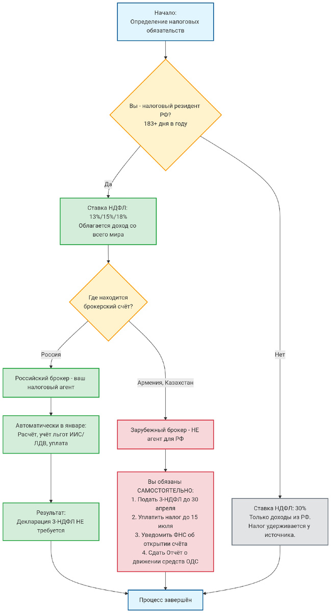 · Армянский / Казахстанский брокер: НЕ является налоговым агентом для РФ. Он не будет удерживать российский НДФЛ. Вы обязаны самостоятельно задекларировать все доходы, полученные на этом счету, в российской декларации 3-НДФЛ и уплатить налог.