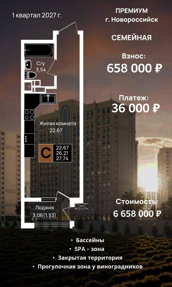 ПВ - можно мат.кап На территории: - Спа-зона - Бассейны - Подземный паркинг - Закрытая территория - Рядом виноградники для прогулок Расчет под семейную ипотеку с ребенком до 7 лет
