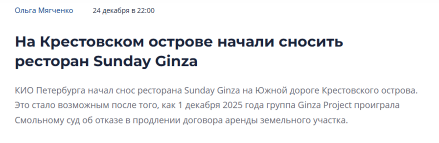 📍 Напомню: Власти Петербурга начали демонтаж ресторана SunDay Ginza на Южной дороге Крестовском острове. Об этом 24 декабря сообщил городской Комитет по контролю за имуществом.