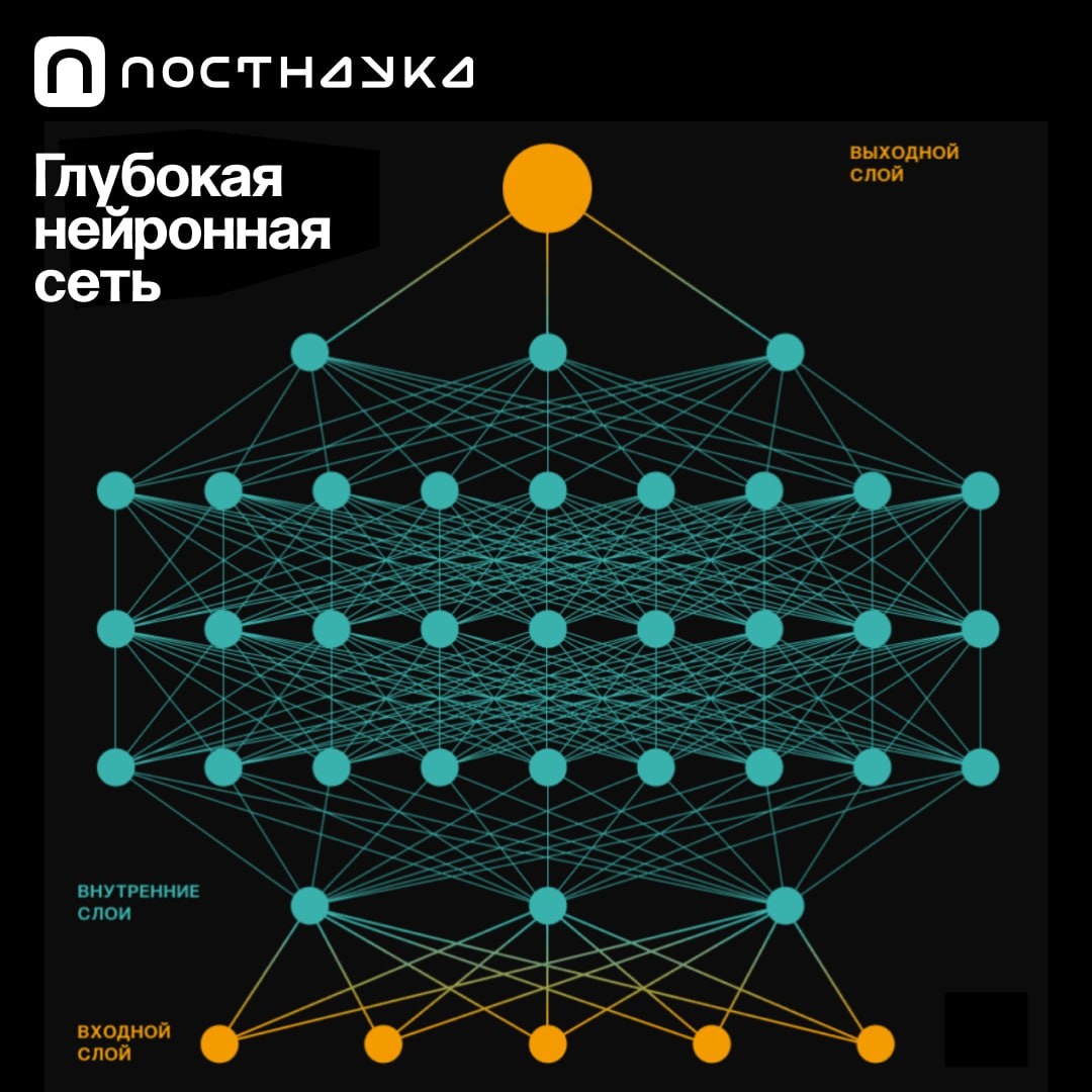 Глубокая нейронная сеть представляет собой сложную программу, состоящую из большого количества внутренних (скрытых) слоев с настраиваемыми параметрами — весовыми коэффициентами искусственных нейронов, составляющих каждый слой сети. На первый, входной слой сеть принимает вектор признаков, описывающих объект — данные в виде сигналов. На внутренних слоях происходит их обработка: входной вектор умножается на матрицу связей, и сформированный таким образом вектор новых признаков передается в следующий слой. Результат обработки сигнала отправляется на выходной слой сети. Как человек научил глубокие нейронные сети распознавать, создавать и предсказывать? Об этом у ПостНаука.Specials есть курс «Глубокое обучение», который мы создали вместе с одним из наших партнеров! Материал доступен на странице со спецпроектами: https://postnauka.org/specials.