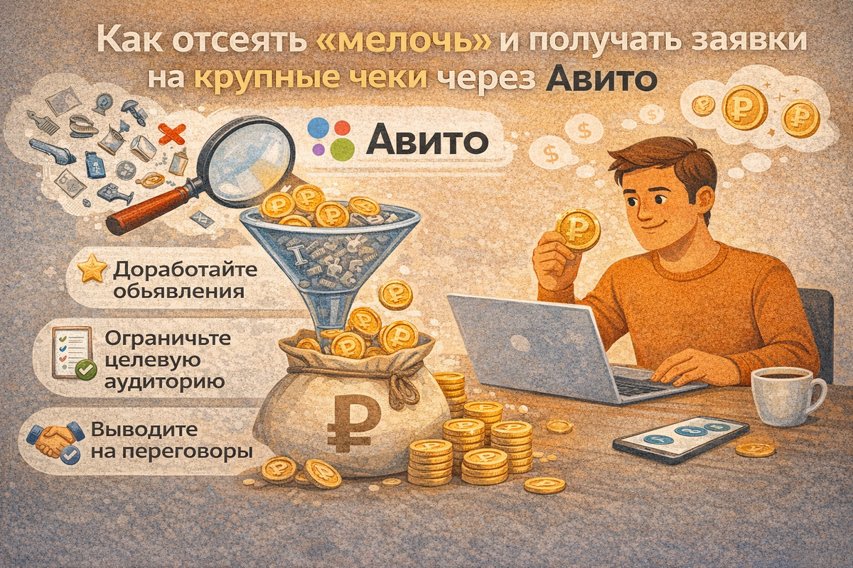 Авито может давать много обращений. Но если не выстроить фильтрацию, вместе с заявками придёт поток «мелочи»: люди без бюджета, с разовыми задачами и запросами уровня «а сколько будет стоить минимально». В итоге менеджеры заняты, а денег нет. По опыту, проблема не в площадке. Проблема в том, как бизнес подаёт себя и какие сигналы даёт аудитории. Разберём, как превратить Авито из источника хаотичных обращений в канал заявок на крупные чеки. Авито – массовая площадка. Люди приходят туда: Если вы не задаёте рамки, платформа приведёт вам всех подряд. Чаще всего мелочь появляется из-за: Площадка просто делает то, что вы ей позволяете. Одно объявление на все услуги притягивает случайных клиентов.