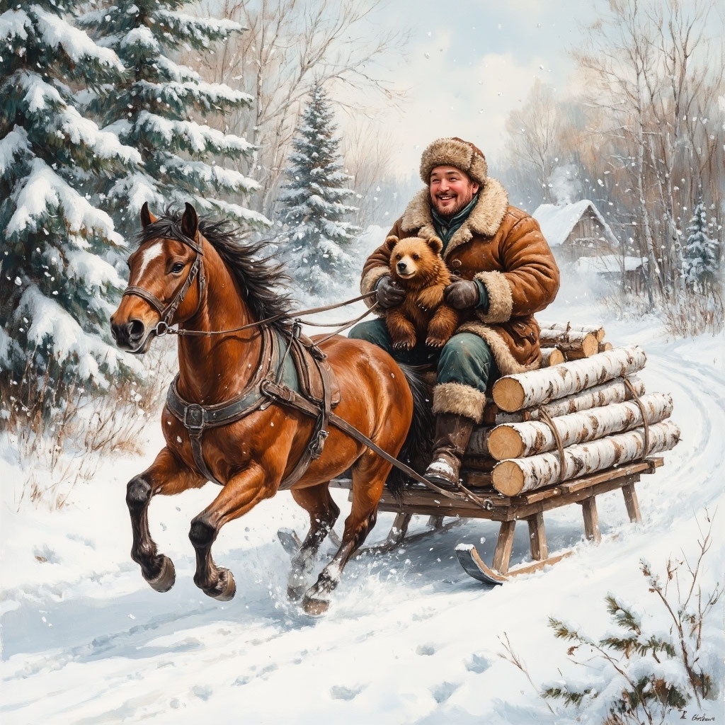 Промт: Зимний деревенский пейзаж, акварельная иллюстрация. Лошадка бодро бежит по снежной дороге, везет полные сани березовых дров. На возе поверх поленьев сидит веселый мужик в тулупе и шапке-ушанке. У него на коленях сидит маленький бурый медвежонок. Сзади на дровах лежит зеленый банный веник. Вокруг