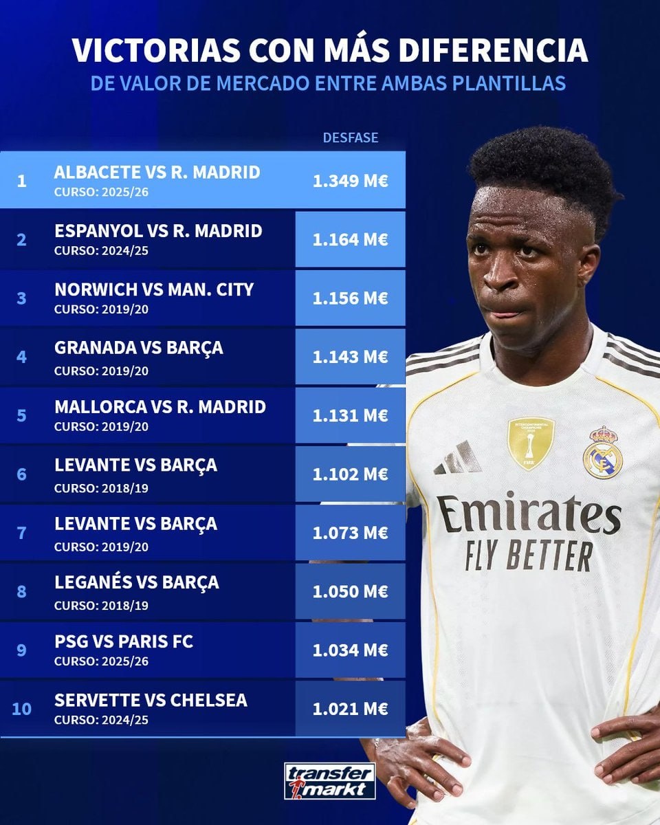 Разница стоимости "Мадрида" и выбившего его из Кубка Короля "Альбасете" по версии Transfermarkt составляет 1.349 млрд евро - рекордный показатель между различными командами в любом турнире в истории (((