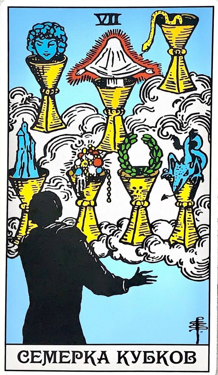 Выходя из дома в тот день, я вытянула карту — это уже стало для меня привычкой перед любым важным делом. В тот момент я не до конца поняла, что означает эта карта и как она может проиграться. Это была Семерка Кубков. Я решила, что это выбор: купаться или бежать и куда бежать. Теперь я понимаю, что эта карта очень точно отразила мою ситуацию: я обзванивала всех и продумывала варианты, как уехать оттуда. Вызвать такси меня остановил только пуховик на голое тело. И, в общем-то, это к лучшему! Ключи от дома были в машине, от которой я потеряла ключи. Четыре часа я провела в метаниях и переборе вариантов. Семерка Кубков говорит о множестве доступных вариантов, о мечтах и фантазиях — а фантазий у меня тогда было предостаточно. Эта карта всегда указывает на неопределенность и потерянность человека, который не знает, какой путь выбрать. Что касается Девятки Мечей, для меня она ассоциируется с негативом. Это как середина конца… После нее всегда следует крах и разрушение. В этой с