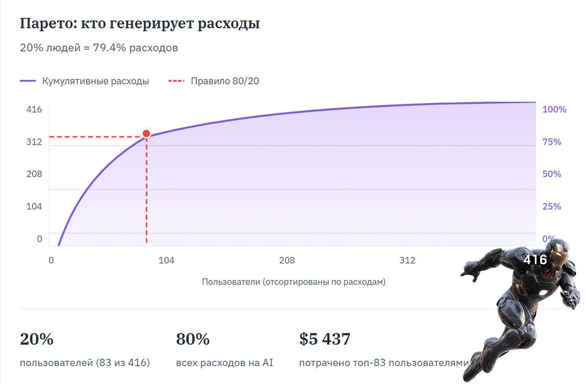 “ai-поведения” Активны были 416 человек, не все использовали. Четыре вывода из их user experience: 1. Правило Парето работает с точностью до процента: 20% пользователей сгенерили 79,4% всех расходов 2. Бухгалтерия и другие не-креативные отделы активно генерируют картинки, как ни странно 3. За 7 месяцев — 27-кратный рост кол-ва запросов, люди втянулись и распробовали 4. Большие Excel-таблицы анализировались плохо, часто модели берут только первые 100 строк и несут уверенный бред; для таблиц нужен Code Interpreter, изолированное Python-окружение, спец. модели И инсайд, зацепивший меня. Power Users, самые активные 3%: — среди 527 человек нашлись 12 людей (3% от 416), — они делали 42% всех запросов и тратили 35% бюджета, — средний Power User делал 1200 запросов и тратил $50 в месяц (обычный юзер делал 120 запросов и тратил $5) МОРАЛЬ: внедряя новые подходы, не обязательно учить абсолютно всех, можно найти эти 3% и прокачивать их, а остальные подтянуться. - Полные результаты, подро