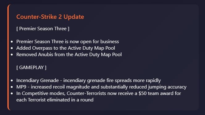 🟠Ротация карт: +Overpass, −Anubis. 🟠Гранаты: зажигательная граната распространяется быстрее. 🟠Оружие: MP9 получил нерф. 🟠Геймплей: CT получают $50 за каждого убитого T. Посмотрим, что Valve принесут с обновлением Season 4. 👍 Esports.ru | CS