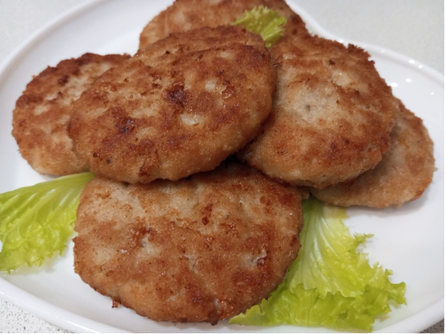 Наверняка такие котлеты готовят многие. Котлет получается много. В моей семье все любят такие котлеты и почти каждый раз слышу, что добавила мало хлеба. Ингредиенты: - мясо свинины с жирком или жирная свинина – 1 кг.; - белый хлеб, батон – 200 гр.; - репчатый лук – 2 луковицы; - яйца – 2 шт.; - соль – по вкусу; - перец черный молотый – по вкусу; - вода для замачивания хлеба – 300-350 мл.; - сухари панировочные – примерно 100-130 гр.; - растительное масло для жарки котлет. Батон нарезать кусочками, сложить в емкость, добавить воду, оставить на 3-5 минут, не более, если оставить надолго хлеб в воде сильно разбухнет и даже если его сильно отжать котлеты могут плохо формироваться, разваливаться при жарке и тогда нужно будет добавить примерно 1 ст. ложку муки. Разбухший хлеб отжать от влаги. Так как моим домашним в таких котлетах мало хлеба, я добавляю 250 гр. белого батона или даже 300 гр. Мякоть свинины с жирком промыть, нарезать на удобные кусочки для мясорубки. Репчатый лук очистить, на