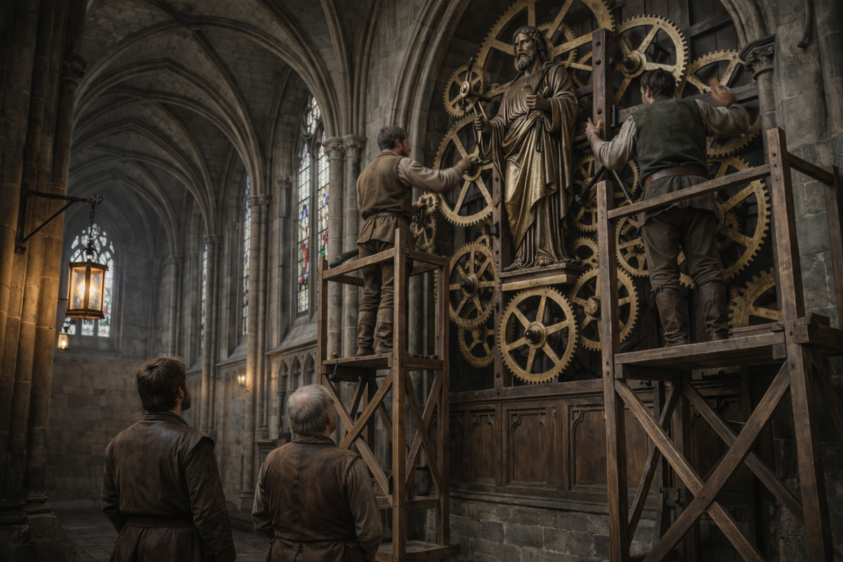 К XIV веку в европейских соборах работало около 300 механических фигур. Ангелы махали крыльями. Святые поднимали руки в благословении. Христос открывал глаза на кресте. Церковь заказывала эти устройства, платила огромные деньги — и одновременно боялась их как огня. Потому что граница между механизмом и чудом стиралась с каждым новым зубчатым колесом.
