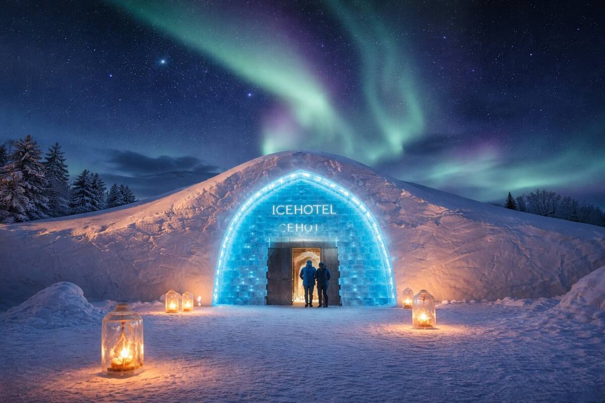 Поймали себя на мысли, что хочется не будильник, а билеты? Значит, всё правильно. Постепенно входим в рабочую неделю и аккуратно собираем энергию для следующих путешествий. Всё как мы любим 😉 А чтобы мечталось чуть легче, хочу показать вам один необычный отель. Не из тех, куда едут «просто переночевать», а из тех, ради которых и планируют поездку. Куда? Ледяной отель в Швеции (ICEHOTEL, Лапландия) Тот самый отель, который каждую зиму строят заново изо льда… Спят здесь тоже на льду. Звучит экстремально, но на деле это один из самых необычных и запоминающихся тревел-опытов, которые только можно придумать. Но не за 5 рублей, естественно 😏 Чем интересно? ICEHOTEL — про особое состояние. Ледяные номера — каждый как арт-объект. Стены, кровати, декор — всё изо льда реки Торне. Температура внутри — около –5°C, но вы спите в специальных термоспальниках, так что холодно не будет. А днём — тёплые комнаты, сауна, прогулки по снегу и, если повезёт, северное сияние прямо над головой. Лучшее время