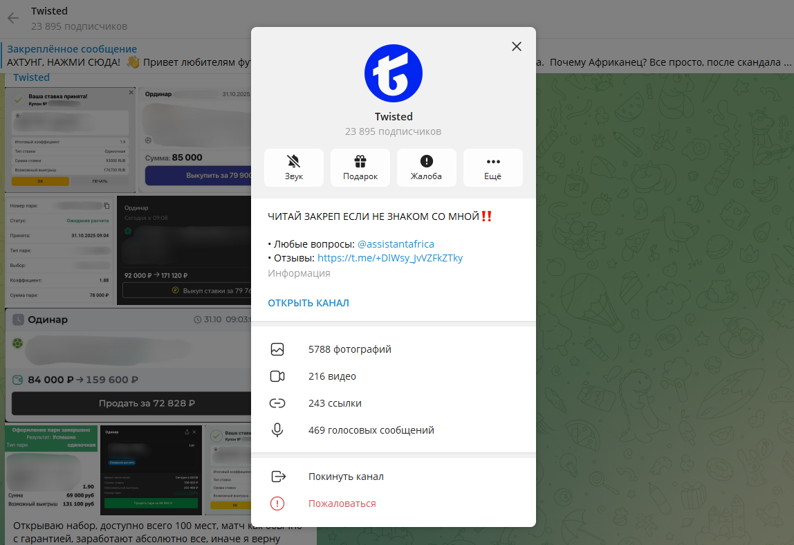 В Telegram снова активно продвигают якобы «новый» ставочный проект — на этот раз под названием Twisted. Реклама шумная и агрессивная: договорные матчи, внутренние инсайды, стопроцентная проходимость и «уникальная информация, недоступная обычным бетторам». Но если снять красивую обёртку и посмотреть на механику проекта, картина становится предельно ясной. Twisted — это не новый сервис и не свежая команда, а очередная попытка хорошо известного мошенника по кличке Африканец перезапустить старый скам после очередной волны разоблачений. Если вы рассматриваете альтернативы ставочным каналам и ищете более спокойные форматы заработка без «инсайдов» и VIP-прогнозов, можно посмотреть пример проекта без беттинга, договорняков и агрессивных продаж. По классической схеме Африканец снова примеряет новый образ — некоего «Игоря», якобы опытного каппера с доступом к закрытой информации.