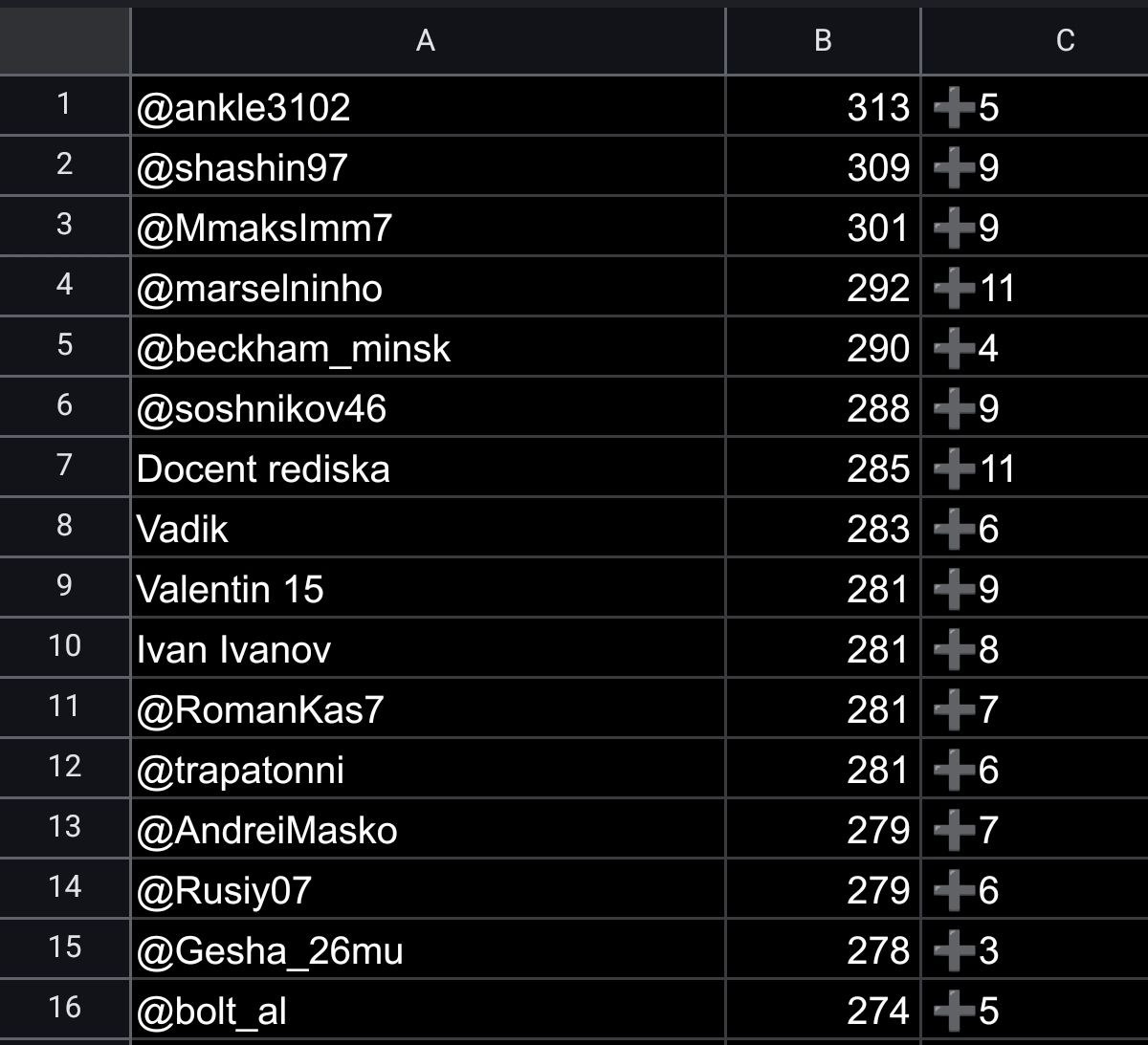 Общая таблица. Полную версию таблицы вы можете посмотреть по этой ссылке https://docs.google.com/spreadsheets/d/1ZoJl0sv8lqxFwjQggiD-NZu6UkkjzzCda6ng7zg4c6Y/edit?usp=drivesdk 🏆В конкурсе на Золотой мяч лучший тур провел @MrVlaDick, который набрал 19 очков – он забирает 3 балла в ЗМ. Второе место на выходных заняли @PPPericoloprimo и @Neondertal – оба набрали по 15 очков, что позволило им получить по 2 балла в копилку ЗМ. И третье место в туре осталось за @Vitysha90, который насобирал 14 очков и забирает 1 балл в Золотой мяч. Полная таблица Золотого мяча сейчас выглядит так: @ankle3102 – 5 @Alighmel – 3 @xarlam55 – 3 @MrVlaDick – 3 @Neondertal – 3 @PPPericoloprimo – 3 @AaaZh8 – 2 @Korchagin95 – 2 @MBacM – 2 @Zlopupyndra – 1 Ivan Ivanov – 1 @Vitysha90 – 1 Результаты матчей и таблицы Лиги чемпионов с Гуд-Лигой уже ждут вас на резервном канале @Звуки Пукки