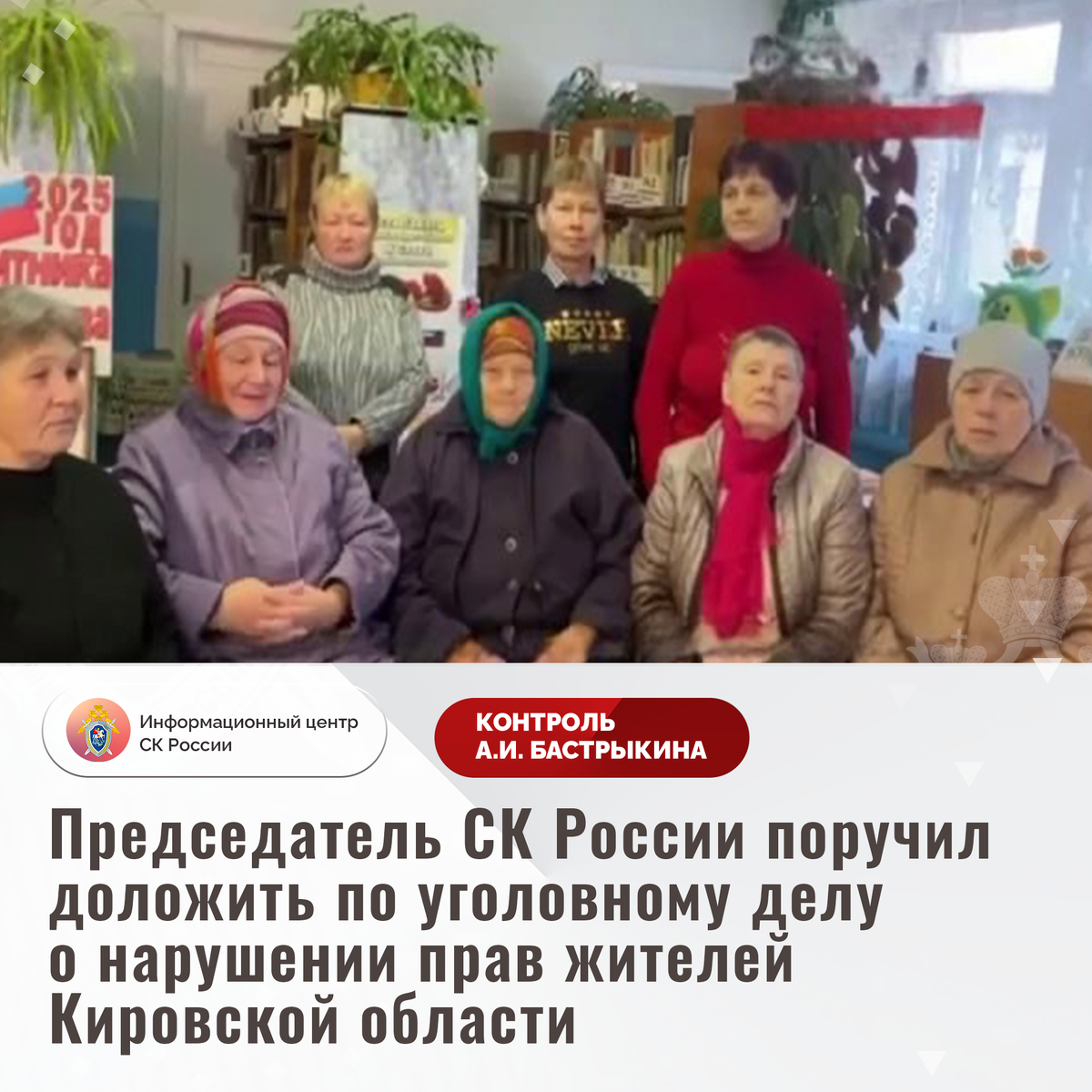 Председатель СК России поручил доложить по уголовному делу о нарушении прав жителей Кировской области В сети Интернет сообщается о нарушении прав жителей отдаленных населенных пунктов Кировской области. На протяжении нескольких лет в ряде деревень и поселков отсутствуют продовольственные магазины, при этом доставка продуктов питания не организована. Также не налажено автобусное сообщение, из-за чего граждане вынуждены добираться на личных автомобилях до больниц и социальных учреждений, расположенных на значительном расстоянии. В СУ СК России по Кировской области по данному факту возбуждено уголовное дело. Председатель Следственного комитета Российской Федерации Александр Иванович Бастрыкин поручил и.о. руководителя СУ СК России по Кировской области Султану Шагировичу Оразаеву доложить о предварительных и окончательных результатах расследования уголовного дела. Исполнение поручения поставлено на контроль в центральном аппарате ведомства. #СледственныйКомитет #СКРоссии #СК #ИЦСКР #Инфор