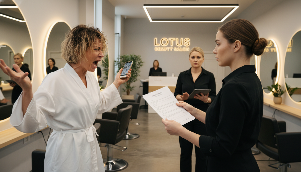 Салон красоты «Лотос». Суббота. День. Я пришла подстричься. Записана на два часа. Сижу в зоне ожидания. Листаю журнал. Из-за перегородки — крик. — ТЫ МНЕ ВОЛОСЫ СОЖГЛА! СМОТРИ, ЧТО ТЫ НАДЕЛАЛА! Все в салоне замирают. Из-за перегородки выскакивает женщина. Лет тридцати пяти. В халате. Волосы мокрые. За ней — парикмахер. Девушка лет двадцати пяти. Бледная. — Я предупреждала вас... — ТЫ НИЧЕГО НЕ ПРЕДУПРЕЖДАЛА! — женщина трясёт телефоном. — Я сейчас в полицию звоню! И в Роспотребнадзор! Ты мне компенсацию будешь платить! К ним подходит администратор. — Что случилось? Женщина разворачивается к ней: — ВОТ ЭТА ДУРА МНЕ ВОЛОСЫ СОЖГЛА! Я просила осветление! А она мне всё спалила! Администратор смотрит на парикмахера. — Лена, объясни. Лена дрожащим голосом: — Клиентка хотела из чёрного в блонд. За один раз. Я объяснила, что это опасно. Что нужен тест на пряди. Она отказалась. Сказала: «Делай быстро, мне некогда». — ВРАНЬЕ! — орёт женщина. — Ничего она не говорила! Администратор берёт планшет. —