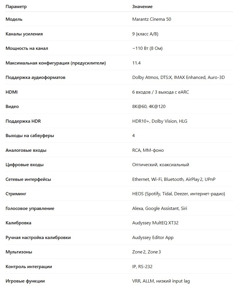Marantz Cinema 50 — это AV‑ресивер 9.4 с акцентом на гибкость и мощность. Он построен на дискретных усилителях класса A/B, выдающих по 110 Вт на канал при нагрузке 8 Ом, что даёт стабильную работу даже с тугими колонками.