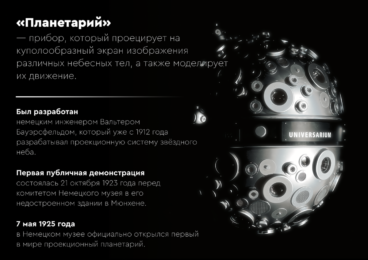 Всё началось в 1929-м, когда страна пахала на тракторах и грезила дирижаблями. Установленный тогда аппарат второго поколения был настоящим механическим титаном. Две большие сферы, похожие на звёздные шары — север и юг. На родине аппарата, в Германии их так и назвали, Star balls – звездные мячи. И еще две сферы поменьше — с художественными изображениями созвездий и их названиями. Он был аскетичен и точен. Никакой автоматики. Оператор вручную, с помощью рычагов и кнопок, вёл сеанс, сопровождая живой лекцией. Это был театр одного актёра и одной машины. Рабочий инструмент для строителей нового мира, которые хотели знать не только о бесклассовом обществе, но и о борьбе человека с гравитацией с темнотой вселенной.