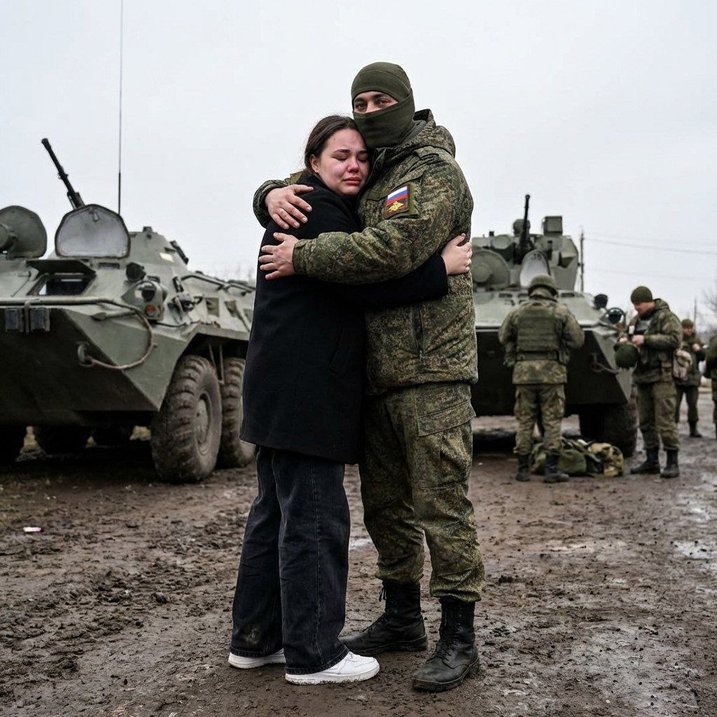 внешности и её черты лица. На переднем плане — девушка, крепко обнимающая мужчину в военной форме и балаклаве. Её глаза закрыты, выражение лица спокойное, но с оттенком грусти, будто она пытается запомнить этот момент или сдерживает слёзы. Солдат держит её в ответ, что создаёт ощущение поддержки. На фоне — серая, пасмурная погода, грязь под ногами, военная техника и другие солдаты, что усиливает атмосферу прощания перед чем-то серьёзным. Всё это делает снимок очень сильным с эмоциональной точки зрения — он передаёт смесь любви, тревоги и гордости. Девушка одета в черное пальто,черные широкие джинсы оверсайс и белые крассовки. Добавь мужчине шеврон России #военные
