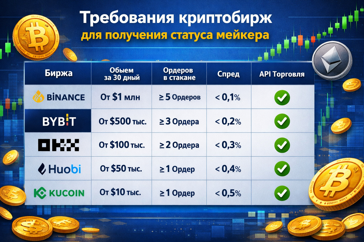 Как и обещал делюсь таблицей с требованием площадок для получения статуса мейкера. Ссылки для регистрации на площадках: 1. https://www.bybit.com/ru-RU/invite?ref=NXDGL7%230 2. https://www.htx.com/invite/ru-ru/1f?invite_code=awsr4223 3. https://promote.mexc.com/r/qLDdIvCj 4. https://t.me/send?start=r-9ofw2 5. http://t.me/wallet 6. https://phemex.com/ru/account/referral/invite-friends-entry?referralCode=DY9PS4 7. https://www.bitmart.com/invite/H5Jj8H/ru 8. https://web.totalcoin.io/web/invite/4973540adba041d49907b5c6635eafce 9. https://koshelek.ru/?r=sbnz 10. https://bitpapa.com/?ref=MmM4MWFlMT 11. https://bingx.com/invite/SGLQQF/ 12. https://www.gate.io/signup/9162512 https://www.kucoin.com/land/register/r/rBCC74M 13. https://www.bitget.com/ru/referral/register?from=referral&clacCode=QL5NW6UH 14. https://www.coinex.com/register?refer_code=9rbpf 15. https://okx.com/join/15246875