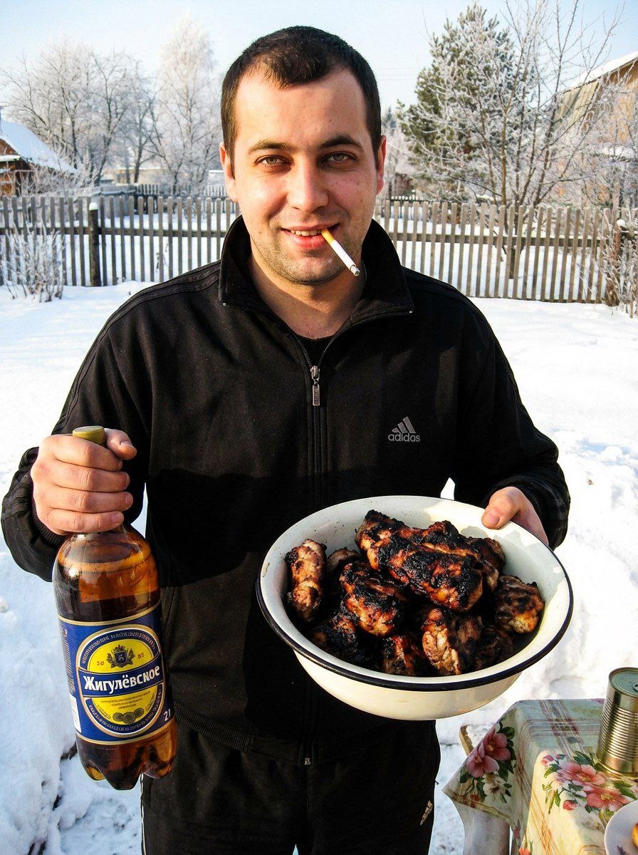 : Формат: Портретный вертикальный снимок 3:4 Эпоха: Имитация цифровой любительской фотографии начала 2000-х Композиция и персонаж: Используй загруженное референсное фото (не изменяй ее черты лица, тон кожи или форму тела. Молодой мужчина с приветливой улыбкой позирует по пояс на фоне заснеженного дачного участка. Со зажженной сигаретой во рту он демонстрирует свой кулинарный результат: в правой руке — большая белая эмалированная миска (тёмный край) с щедрой порцией мяса, обугленного на открытом огне; в левой — пластиковая бутылка пива «Жигулёвское» объёмом 1,5–2 литра. На персонаже — классический спортивный костюм Adidas чёрного цвета. Окружение и детали: Справа внизу — край стола с пёстрой клеёнкой (цветочный узор) и жестяная банка На фоне: густой снег, фрагменты деревянного забора, деревья с инеем Шашлык в миске: куски мяса с тёмной, местами обугленной корочкой Яркая этикетка пива хорошо видна Освещение и цветопередача: Жёсткий прямой солнечный свет создаёт контрастные тен