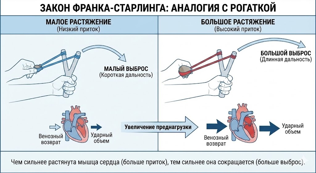Суть проста: чем сильнее растянуть сердечную мышцу притоком крови, тем сильнее она сократится в ответ. Представьте резинку от рогатки: чем дальше оттянешь, тем дальше полетит камень.