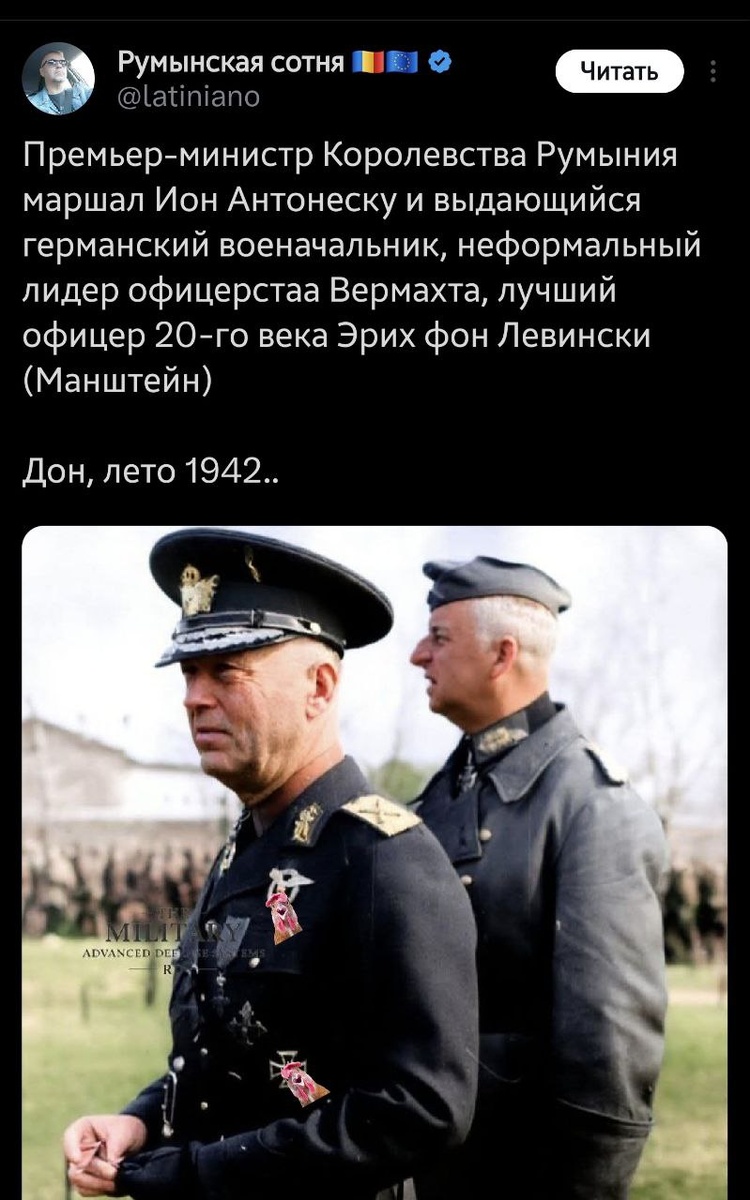 Цыган восторгается нациками, хотя они бы сделали из него мыло или абажур – ну ладно, поверил в себя, записался в арийцы, как соседи через Тису. Но пациент же не только русофоб и цыган. Еще он мнит себя интеллектуалом. Который почему-то не в курсе, что подопечные этого Антонеску были рекордсменами по скоростной сдаче в плен. Если итальянцы на стороне Гитлера воевали плохо, то румыны даже не воевали. Только мирных кошмарили и в резерве отсиживались. Это примерно как респектовать французам или датчанам, которые быстрее всех плохому австрийскому художнику присягнули. Яблочный Стас