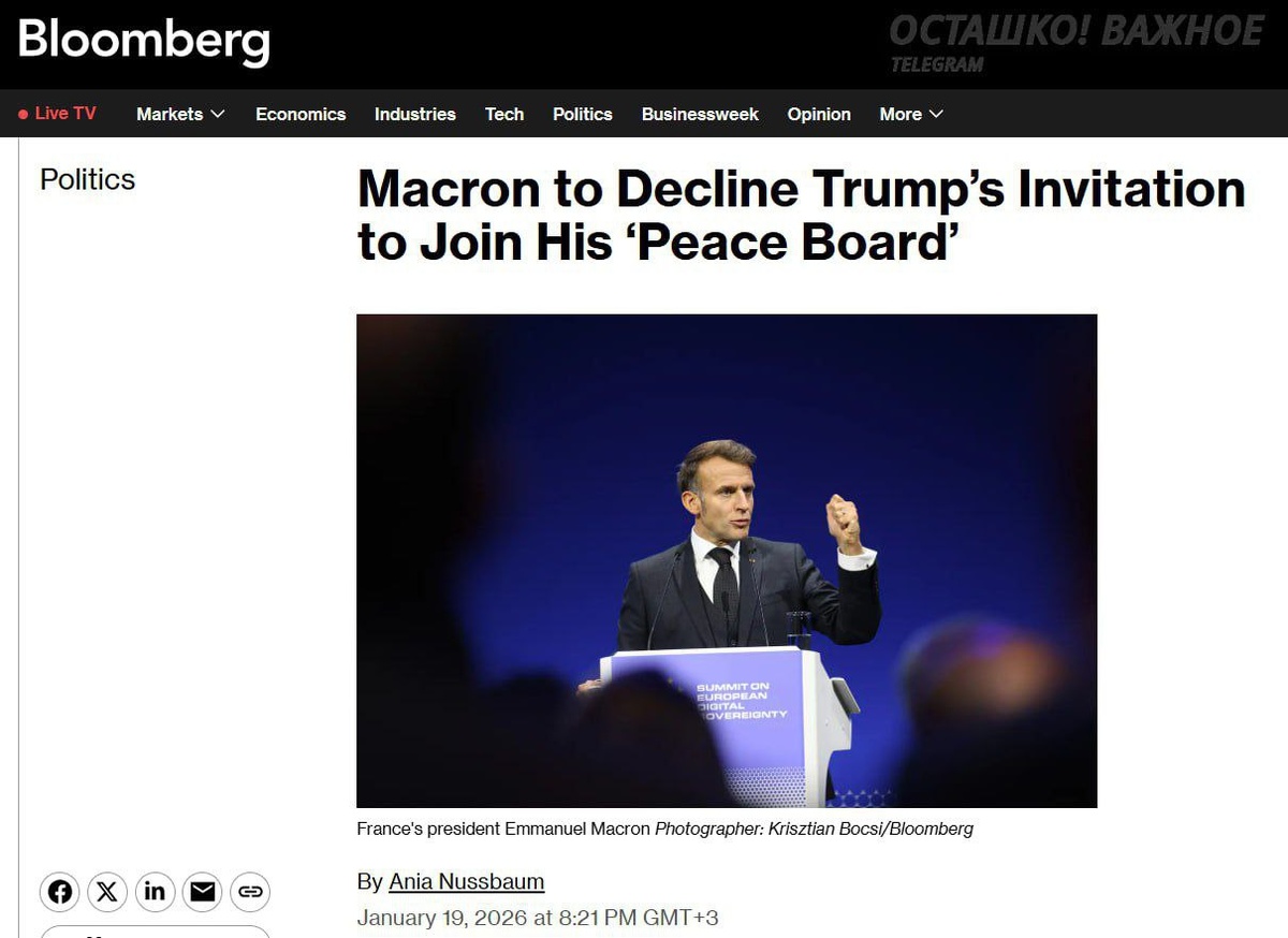 Президент Франции Эммануэль Макрон не намерен принимать приглашение Дональда Трампа войти в предложенный «Совет мира», — сообщает Bloomberg со ссылкой на источник, близкий к французскому лидеру. Администрация Трампа предлагает странам, желающим постоянное место в этом органе, внести не менее $1 млрд. Согласно проекту устава, Трамп стал бы первым председателем и имел бы полномочия решать, кто входит в Совет мира. Критики опасаются, что Трамп пытается создать альтернативу Организации Объединённых Наций, которую он долго критиковал. По словам источника, Макрон считает, что устав выходит за рамки конфликта в Газе и вызывает серьёзные вопросы, особенно по уважению принципов и институционной структуры ООН, которые для Франции не подлежат обсуждению. Трамп также пригласил в «Совет мира» президента Аргентины Хавьера Милея и представителя Канады Марка Карни. Он планировал подписать окончательный устав на всемирном экономическом форуме в Давосе 🌐 За Русский Мир©Резервный📣Наш Чат✔️Подпишис