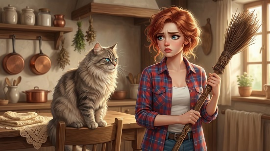 Алиса, слегка успокоившись после дискуссии о дресс-коде, уже направилась к чулану, чтобы выкатить оттуда свою капризную метлу. Но Платон, словно тень, мягко спрыгнул с полки и преградил ей путь.