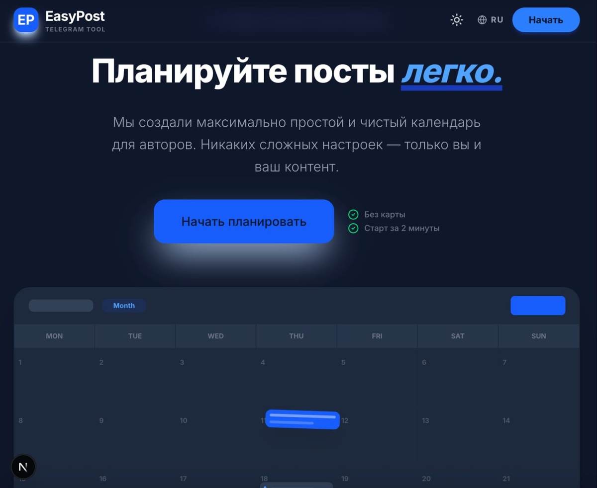 ! 👋 Я тут решил запилить свой проект - EasyPost 🛠 Это планировщик постов для Telegram. Почему? На самом деле как и с LMS системой решение пришло из моей боли. Я редко пишу посты для телеграма сразу в телеграм. Чаще сначала в notion, или в каком-нибудь редакторе. Выглядит примерно так: Делаю красивый текст в Notion → копирую в Telegram → и... форматирование улетает в космос. Приходиться текст прям тут форматировать заново. Минус еще в том, что редактор приложения телеграм ограничен. Через html(то есть через бота) возможностей больше. Все кто ведет свой канал, как правило, если он небольшой(как у меня), то публикуют руками через телеграм, у кого побольше или несколько каналов, то используют сервис какой-то, либо своего бота. В общем пошёл искать планировщик(честно сказать не особо запаривался поиском): 💲 платные (там реально круто, но мне не нужны половина фич, а платить $20/мес не хотелось) 🆓 бесплатные, но “1 канал / 1 бот / куча ограничений” 🖕 или просто кривенькие Короче,