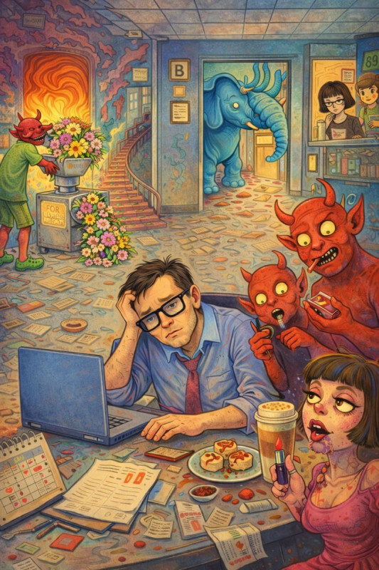 За утро он не получил ни одного нового письма, значит пора разгребать завалы. Виталий надел наушники, чтобы не слышать ругань чертей, разбил задачи по приоритетам и приступил к выполнению. Вечер пришел незаметно. Черти затихли, кто-то смыл кровь с лестниц, синий слон напрыгался и ушел обратно на свой постамент. То что осталось от Аллочки — туловище и наполовину перемолотая в мясорубке голова — подгребло в кабинет и пыталось забрать у чертей остатки помады.