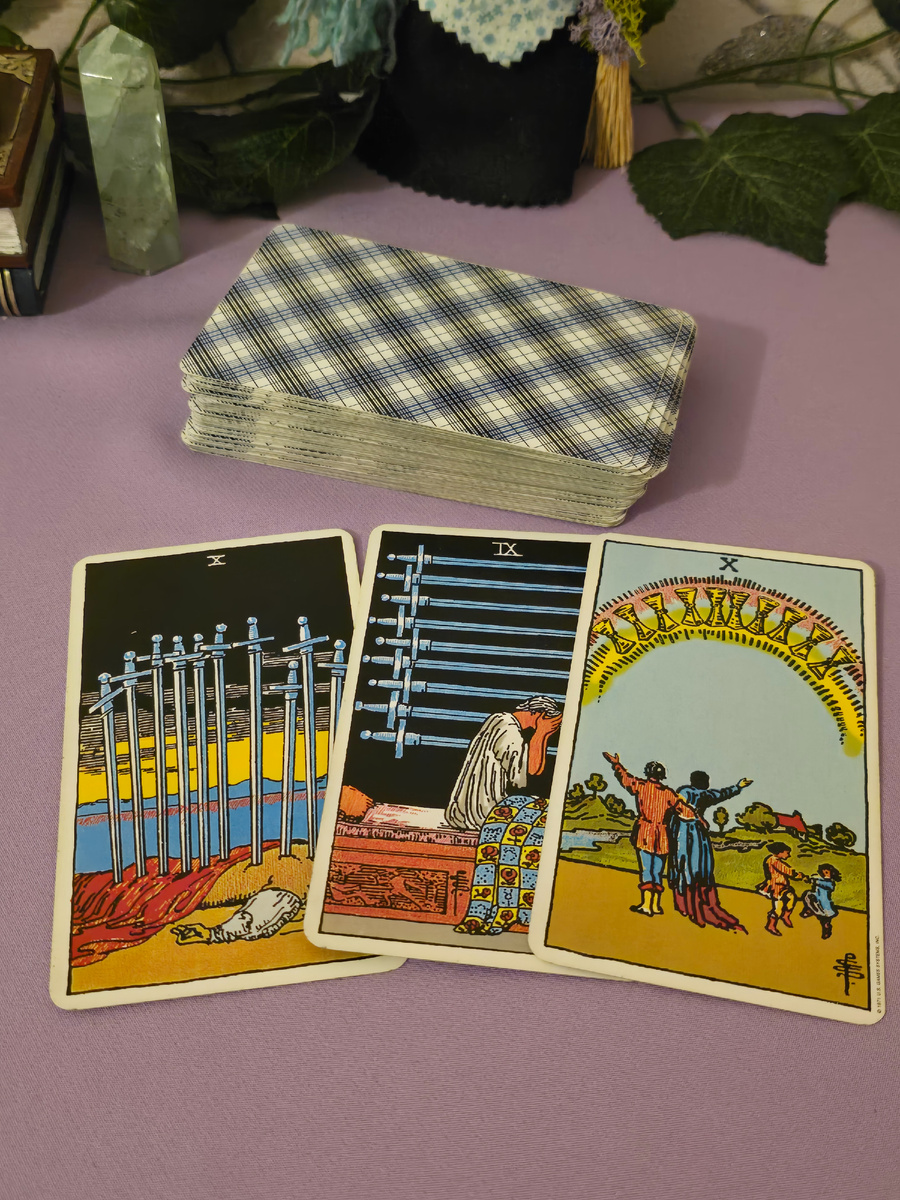 Для расклада на тему «Заколдованный круг. Как выйти из застоя?» выпали три очень ярких, глубоких и говорящих аркана: 10 Мечей, 9 Мечей и 10 Кубков. Вместе они рисуют невероятно насыщенную картину внутренней работы.