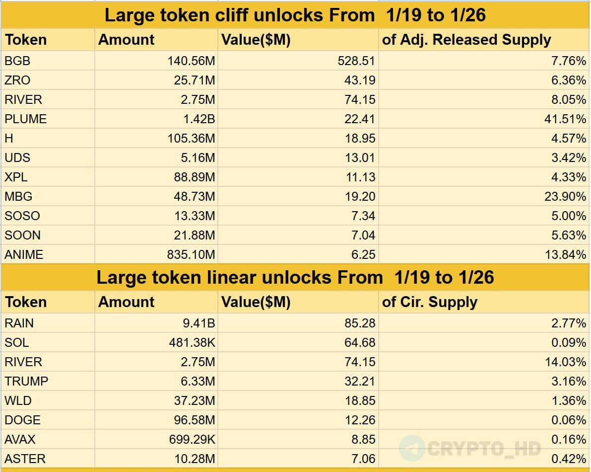 🔓 ТОП разблокировок токенов с 19 по 26 января! Cliff Unlocks: ▫️#BGB - $528,51m ▫️#RIVER - $74,15m ▫️#ZRO - $43,19m ▫️#PLUME - $22,41m ▫️#MBG - $19,20m ▫️#H - $18,95m ▫️#UDS - $13,01m ▫️#XPL - $11,13m ▫️#SOSO - $7,34m ▫️#SOON - $7,04m ▫️#ANIME - $6,25m Linear Unlocks: ▫️#RAIN - $85,28m ▫️#RIVER - $74,15m ▫️#SOL - $64,68m ▫️#TRUMP - $32,21m ▫️#WLD - $18,85m ▫️#DOGE - $12,26m ▫️#AVAX - $8,85m ▫️#ASTER - $7,06m P.S. Cliff Unlocks – разблокировка крупной порции токенов единовременно в конкретную дату. Linear Unlocks – постепенная разблокировка токенов в течение определенного периода (обычно каждый день или каждую неделю по части). Crypto Headlines