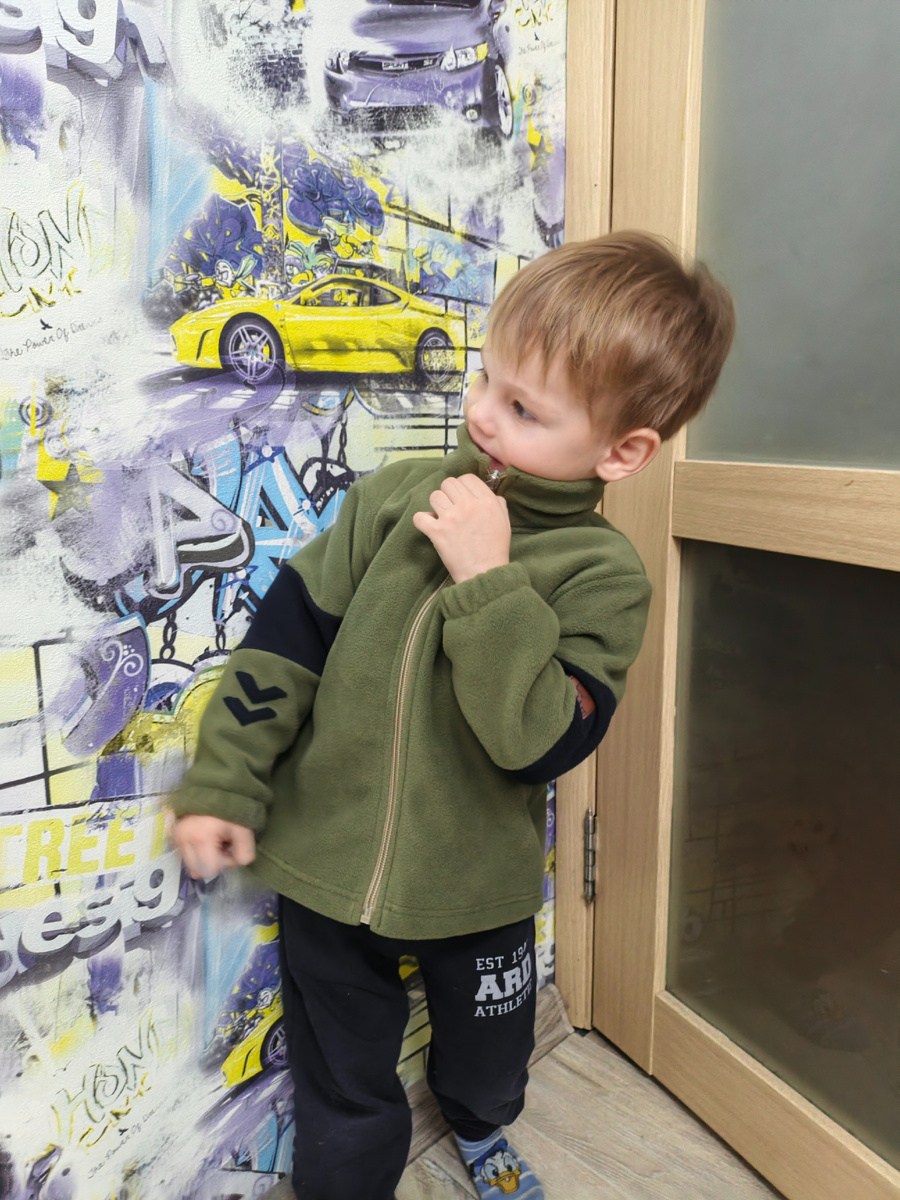 И тут я вспомнила, что в прошлом году тоже оставался кусок флиса. Я тогда шила кофту цвета хаки и у меня остался узкий длинный кусочек. Я тогда решила, что из него получится отличная кофта для Васи. Но тогда у Васи уже была кофта, а вот сейчас имеющиеся кофточки стали тесноваты. Да и одеваются они, в основном, через голову и Вася по утрам вечно скандалит из-за этого спросонья 😂