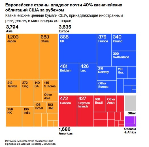 , инвесторы обсуждают одну крайнюю потенциальную контрмеру. Европейские страны владеют триллионами долларов в виде облигаций и акций США, часть из которых находится в фондах государственного сектора. Это порождает слухи о том, что они могут продать эти активы в ответ на возобновление Трампом тарифной войны, что потенциально приведёт к росту стоимости заимствований и падению акций, учитывая зависимость США от иностранного капитала. Но это легче сказать, чем сделать. Большая часть этих активов принадлежит частным фондам, не подконтрольным правительствам, и в любом случае такой шаг, скорее всего, навредит и европейским инвесторам. Поэтому большинство стратегов считают, что вероятность того, что политики зайдут так далеко, невелика, учитывая их нежелание противостоять Трампу с момента его возвращения к власти год назад. Тот факт, что главный стратег Deutsche Bank AG по глобальным валютным операциям тем не менее открыто говорит о «превращении капитала в оружие», свидетельствует о том, чт