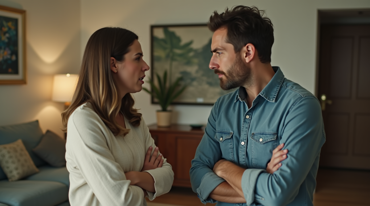 Сергей стоял посреди гостиной, скрестив руки на груди. Вечерний свет из окна падал ему на лицо, подчёркивая резкие скулы и напряжённую линию рта. Он не отводил взгляд.