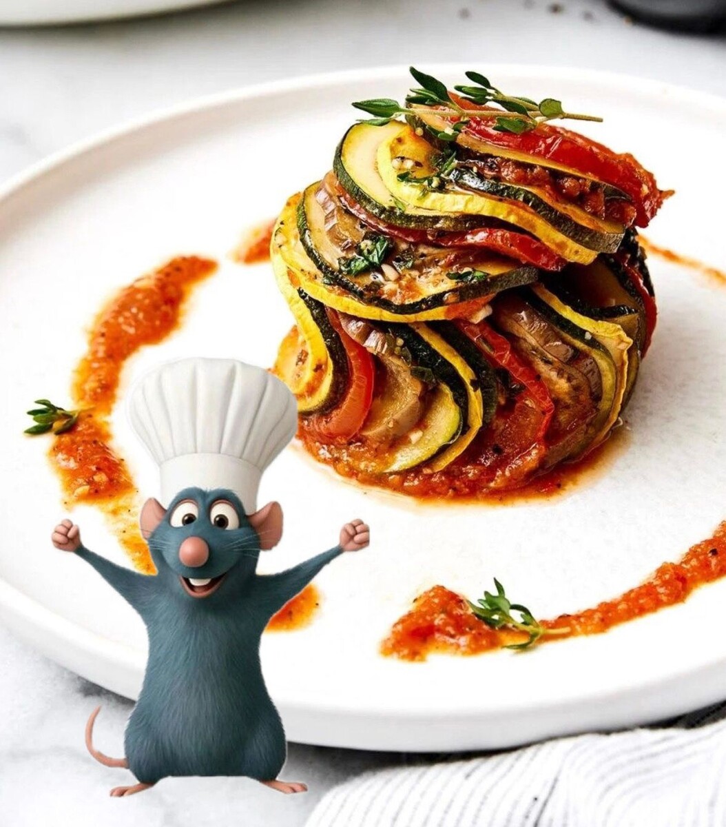 Рататуй как в мультике: блюдо, которое готовят не ради сытости, а ради чувств После выхода мультфильма «Рататуй» это блюдо стало символом не просто французской кухни, а воспоминаний, уюта и настоящей любви к еде. Тот самый момент, когда строгий критик Антуан Эго пробует рататуй — и мгновенно возвращается в детство, — показал всему миру: еда может быть сильнее слов. И именно этот вариант — confit byaldi — мы и будем готовить. ⸻ 🕰 Небольшая история рататуя Классический рататуй родом из Прованса. Раньше это была крестьянская еда: овощи, которые росли на грядке, медленно томили в одной кастрюле, чтобы накормить семью. Но версия из мультфильма — не деревенское рагу. Это шефская интерпретация, созданная американским шефом Томасом Келлером специально для фильма. Он взял идею рататуя и превратил её в изящное овощное блюдо высокой кухни — аккуратные ломтики, запечённые слоями, с насыщенным соусом. ⸻ 🍅 Ингредиенты (простые, но важны детали) Для овощей: