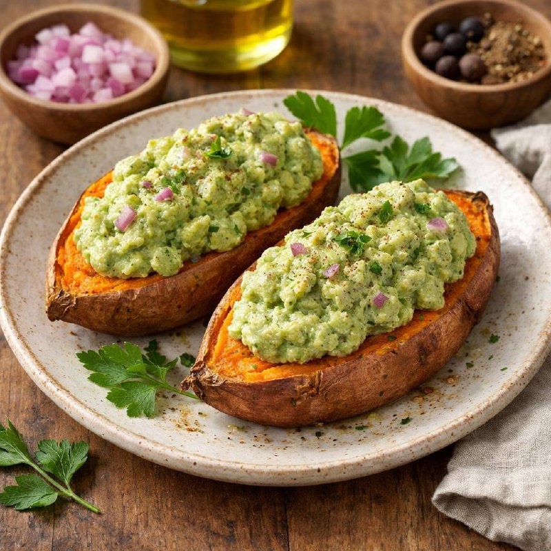 🔥 Сегодня у нас в меню запечённый батат с фасолью и авокадо Зима— идеальное время для такого блюда. Сочетание сладкого и немного острого вкуса наполнит энергией. За счёт того, что в рецепте есть фасоль и авокадо, блюдо получается сытным и сбалансированным по белкам, жирам и углеводам. Нам нужны: • 2 небольших батата, • ⅓ стакана фасоли (я люблю белую крупную фасоль сорта лима, но подойдет любая), • 1 спелый авокадо и пару веточек любой зелени, • 1/4 фиолетовой луковицы, • уксус (погасить лук), • оливковое масло, • соль по вкусу, • и специи: 2 горошины душистого перца, ½ ч.л. гарам-масалы, щепотка асафетиды. Готовим: 👉Предварительно замочите фасоль на пару часов, можно на ночь. 👉Затем отварите её до готовности. В середине варки добавьте асафетиду и душистый перец. 👉Помойте батат. Наколите его несколько раз вилкой, заверните в пергамент и запекайте в духовке на 200 градусов 30-40 минут до мягкости. Проверяйте готовность ножом. Тем временем приготовьте заправку: *️⃣Нарезанный лу