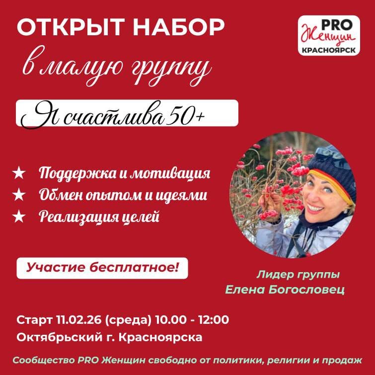 «Я Счастлива 50+» Участие безоплатное! 🎁 👉 Кто сказал, что после 50 жизнь замедляется? 👉 Мои 50+ — это мой персональный энерджайзер! 👉 Дети выросли, и эта свобода — не для дивана, а для настоящих приключений! 👉 50+ — это про мощный драйв, крепкое здоровье и любовь к себе и миру вокруг! Кто со мной? 👉 Я не просто живу — я заряжаюсь! 👉 И мой главный источник силы — находится внутри меня и во всем что окружает меня здесь и сейчас 👉 Мы создаем круг доверия женщин где можно быть самой собой Группа будет проходить по методологии сообщества PRO Женщин, которая уже зарекомендовала себя как рабочая и результативная! ✔ Старт 11 февраля 10:00 - 12:00 ✔ Встречи по средам ✔ Еженедельно, 6 встреч ✔ Уютные кафе в Октябрьском районе г.Красноярска ⭐️ Если хотите присоединиться или задать вопрос, пишите лидеру группы Елене Богословец в личные сообщения @elenabogoslovets В малых группах нашего сообщества Вы получите мощный ресурс - поддерживающее окружение с целью самореализации и достижения