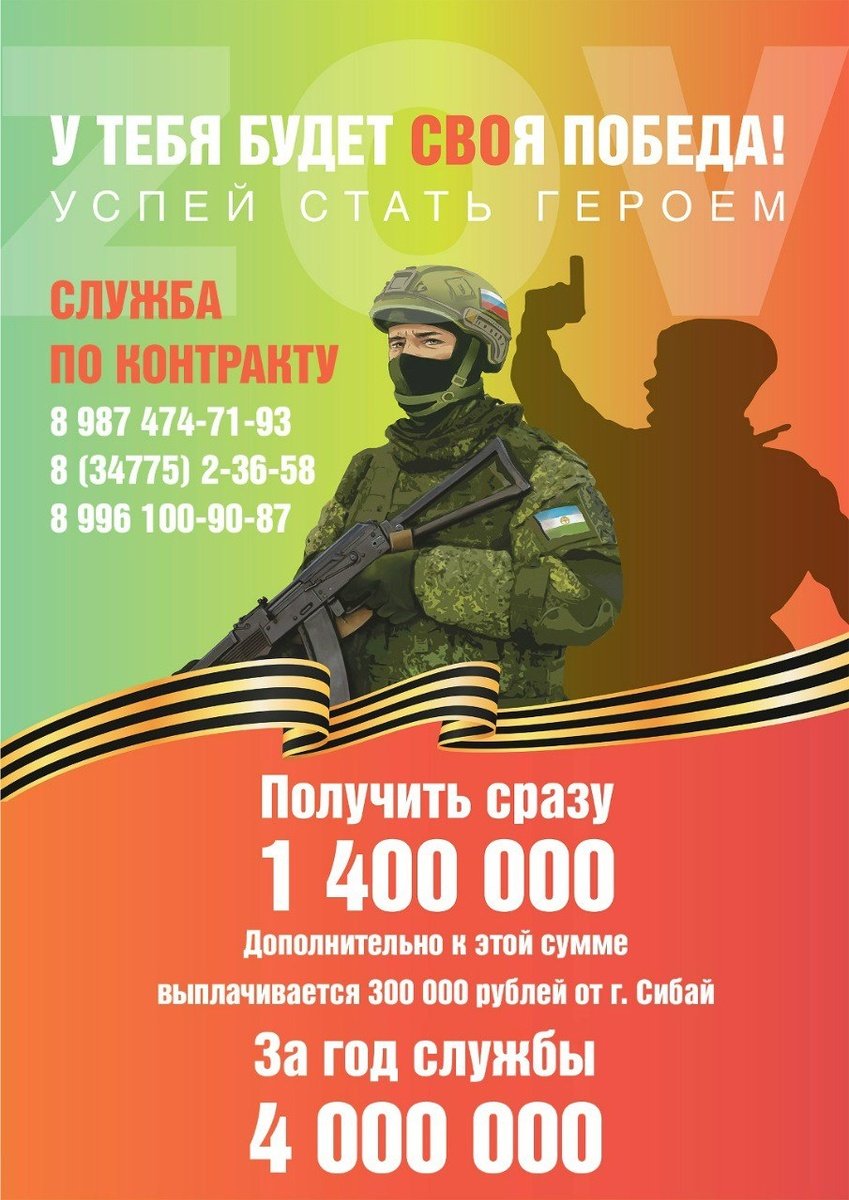 ! Получи сразу 1 400 000 руб + 300 000 руб от г. Сибай Для поступления на службу по контракту необходимо обратиться в военкомат по адресу: г. Сибай, ул. Пионерская, 7, тел. 8-987-474-71-93; 8 (34775) 2-36-58; 8-996-100-90-87. #Сибай #СВО2026