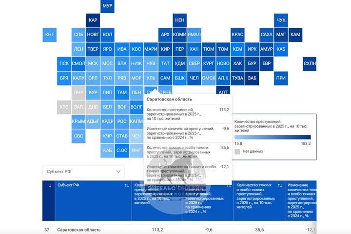 Саратовская область по итогам 2024 года ухудшила позиции в рейтинге регионов РФ по уровню преступности. Результаты исследования были опубликованы сегодня, 20 января, РИА Новости. По данным МВД, в 2025 году было зарегистрировано 1,77 миллиона преступлений, что на 7,3% меньше, чем за 2024 год. Общее количество зарегистрированных преступлений снизилось в 80 регионах, выросло всего в пяти. Рейтинг построен на основе данных МВД РФ и Росстата путем ранжирования регионов по количеству преступлений, зарегистрированных в 2025 году на 10 тысяч жителей. Саратовская область по итогам 2025 года заняла 37-е место, хотя в 2024 году была на 33-м. В регионе зарегистрировано 113,2 преступления на 10 тысяч жителей, что чуть ниже среднероссийского уровня. Снижение за год произошло на 9,6%. При этом количество тяжких и особо тяжких преступлений снизилось на 12,1% и составило 35,6 на 10 тысяч. Лидирует в рейтинге со значительным отрывом, как и ранее, Чеченская Республика, где в прошлом году было зарегист