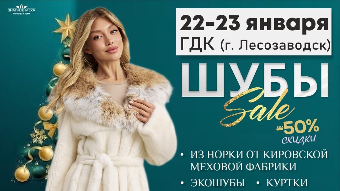 ЛЕСОЗАВОДСК! Ждём Вас: ▫️ 22-23 января! 📍 ГДК, ул. Пушкинская, 32. (с 10 до 19ч.) ДЛЯ ВАС ВЫГОДА И ВЫБОР: 🔥 Шубы из мутона – ОТ 9900 РУБ.! ⚡️ НОРКОВЫЕ ШУБЫ ДО - 50%! 🎉Праздничные подарки, каждому покупателю! 🎁Новинка сезона-ЭКО МЕХ (в ассортименте)! 🔹 Огромный выбор: шубы, эко-мех, куртки, шапки, варежки. 🔥Каталог, акции и новости - все в одном месте. Присоединяйся к нашей группе в ВК https://vk.com/zolotovyatki и смотри полный ассортимент с фото и ценами. ✅ Нужна консультация? Звоните! Наш Телефон: 📲8-922-903-32-83 Покупайте теплую и стильную шубу с МАКСИМАЛЬНОЙ ВЫГОДОЙ!