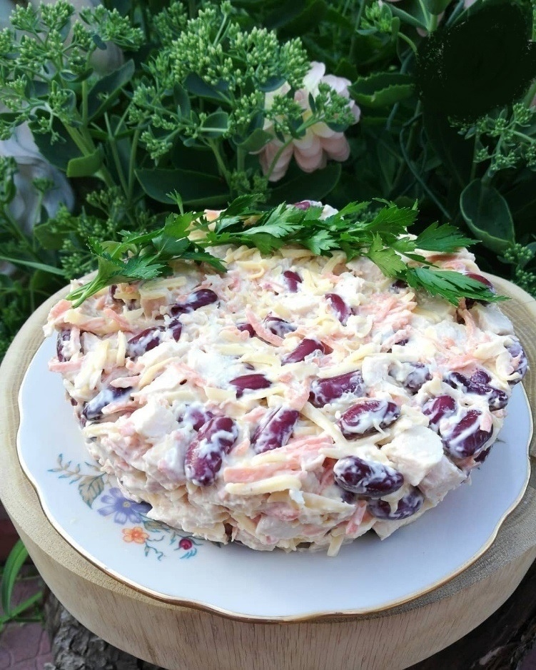 Фасоль необходимо промыть под водой, слить жидкость и дать ей стечь через сито. Филе нарезать кубиками. С моркови тоже слить лишнюю влагу, затем нарезать. Сыр натереть на тёрке. Все компоненты смешать, при необходимости добавить соль и перец, заправить майонезом. По желанию можно добавить чеснок, но я решила не использовать его. Всё тщательно перемешать. Выложить салат в разъёмное кольцо, поставить в холодильник примерно на час. После этого аккуратно снять кольцо и украсить зеленью!
