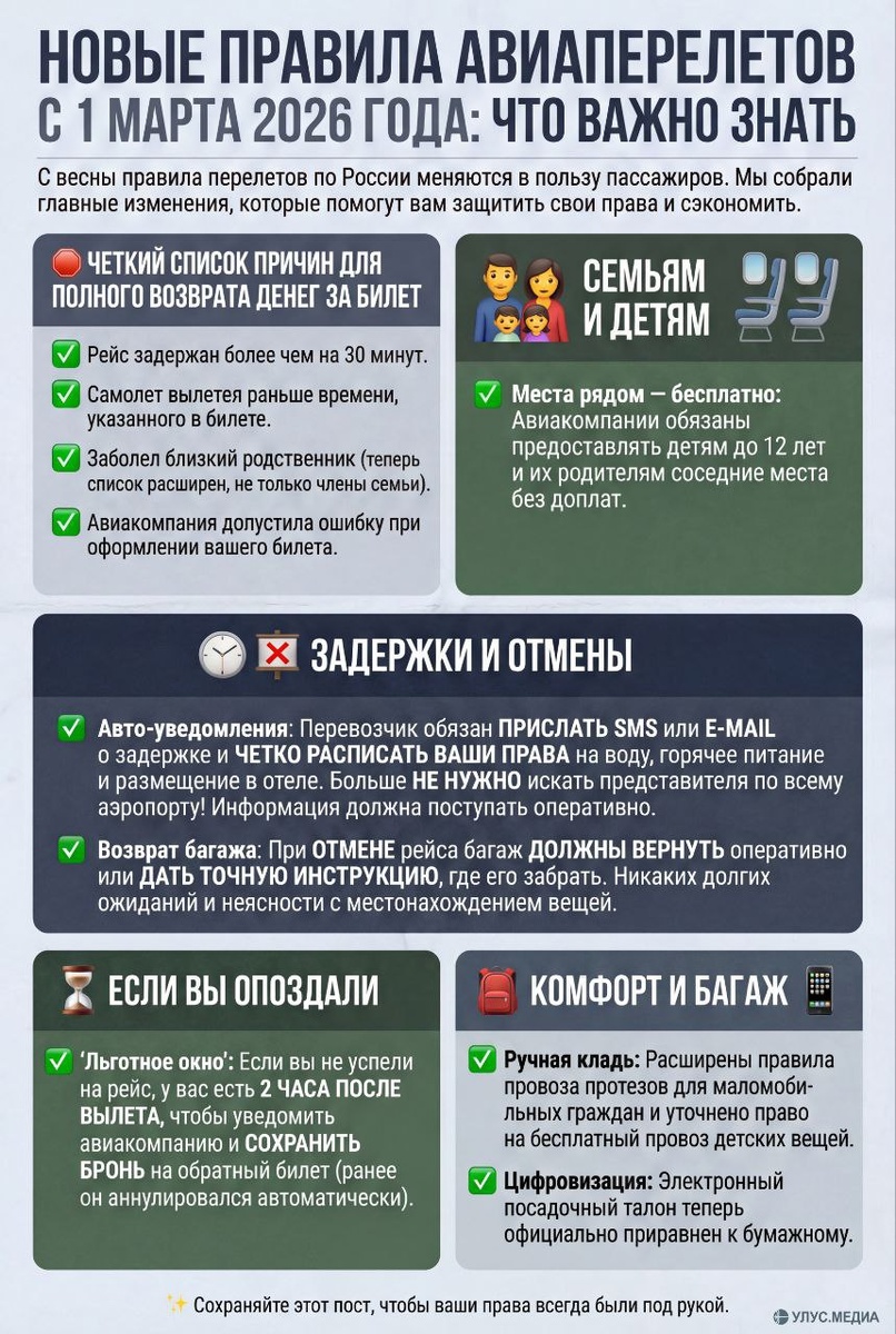 Этой весной вступают в силу обновлённые правила авиаперелётов по России. Изменения направлены на защиту прав пассажиров и повышение прозрачности процедур. Мы собрали для вас самые важные изменения👆 @ulusmedia 📲 Читайте нас в MAX