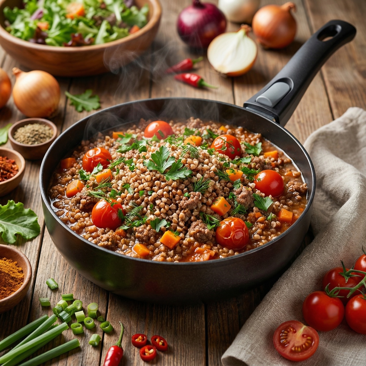 Очень домашнее, сытное и ароматное блюдо «два в одном»: и гречка, и мясо сразу. ✅ говяжий фарш — 400 г ✅ гречка — 250 г ✅ морковь — 1 шт. ✅ лук — 1 шт. ✅ помидоры — 3 шт. (примерно 250 г) ✅ чеснок — 3 зубчика ✅ зелень (укроп) — по вкусу ✅ сливочное масло — небольшой кусочек (10–20 г) ✅ растительное масло — для жарки ✅ чёрный перец, паприка, хмели-сунели — по вкусу ✅ соль — по вкусу ✅ вода или бульон — 500–600 мл (примерно 2 части жидкости на 1 часть гречки) ▪️ Гречку промываем. Лук мелко рубим, морковь натираем на тёрке, помидоры нарезаем кубиками (по желанию можно снять кожицу), чеснок измельчаем, укроп шинкуем. ▪️ В сотейнике KALITVA линейки KUMIR HANDLE