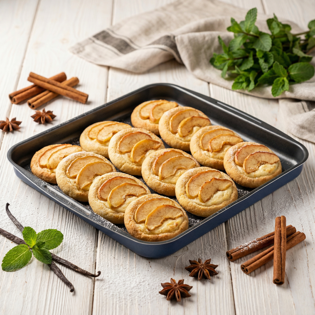 Сегодня приготовим мини-ватрушки. Не сдобные, а на мягком творожном тесте — почти что печенье с яблоками, но очень мягкое. ✅ творог — 450 г ✅ яйца — 2 шт. ✅ манка — 130–140 г ✅ сахар — 80 г ✅ разрыхлитель — 2 ч. л. ✅ ванилин — по вкусу ✅ фрукты и ягоды — по вкусу (на фото — яблоки) ▪️ Творог, яйца, сахар, ванилин смешиваем до однородности. Добавляем манку и разрыхлитель, ещё раз перемешиваем. Оставляем массу на 10–15 минут, чтобы манка набухла. ▪️ Противень KALITVA линейки AZURE застилаем пергаментом или слегка смазываем маслом. Из творожного теста формуем лепёшки, выкладываем на противень и делаем бортики (можно слегка прижать центр стаканом или пальцами). ▪️ Яблоки нарезаем тонкими дольками. Раскладываем ломтики по центру каждой ватрушки, слегка вдавливая. ▪️ Выпекаем при 180°C 20–30 минут до румяных краёв. Даём немного остыть. По желанию посыпаем сахарной пудрой. ✨ Подаём творожные ватрушки тёплыми или остывшими: нежное творожное тесто, мягкие яблочные дольки и лёгкий ванильный аром