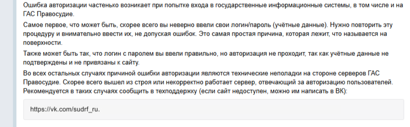 1 минуту назад Ошибка авторизации частенько возникает при попытке входа в государственные информационные системы, в том числе и на ГАС Правосудие. Самое первое, что может быть, скорее всего вы неверно ввели свои логин/пароль (учётные данные). Нужно повторить эту процедуру и внимательно ввести их, не допуская ошибок. Это самая простая причина, которая лежит, что называется на поверхности. Также может быть так, что логин с паролем вы ввели правильно, но авторизация не проходит, так как учётные данные не подтверждены и не привязаны к сайту. Во всех остальных случаях причиной ошибки авторизации являются технические неполадки на стороне серверов ГАС Правосудие. Скорее всего вышел из строя или некорректно работает сервер, отвечающий за авторизацию пользователей. Рекомендуется в таких случаях сообщить в техподдержку (если сайт недоступен, можно им написать в ВК): https://vk.com/sudrf_ru.