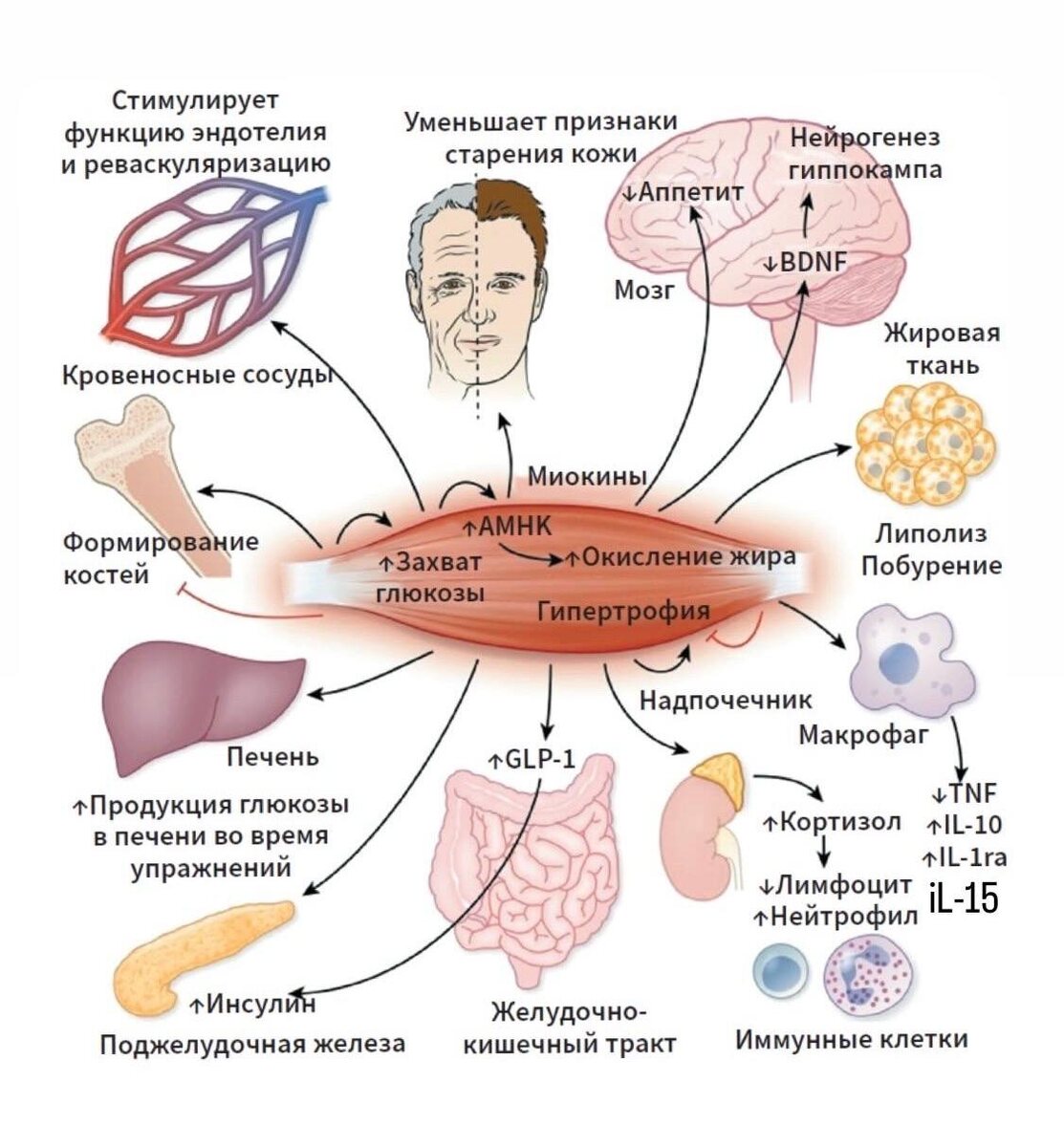 Мышцы, которые двигаются, взаимодействуют с кожей, и движение, как выяснили исследователи из университета МакМастера в Онтарио, дает очень интересный эффект. У участников эксперимента кожа помолодела на 20 лет. Особую роль здесь играет определенный миокин, мышечный медиатор под названием «интерлейкин-15». (Миокин – это цитокин или пептид, который секретируется миоцитами в результате механической работы мышц.) После программы физических упражнений содержание в образцах кожи интерлейкина-15, который выделяют мышцы при движении, повысилось на 50 %. В целом структура кожи активных людей оказалась гораздо больше похожа на таковую у 20–30-летних, хотя некоторые активные испытуемые были старше 65 лет. Тренируйтесь!💪