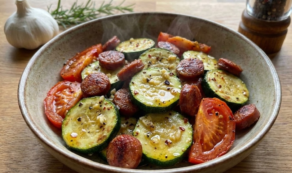 Помидоры: Нарежьте их крупными дольками. Кидайте в раскаленную сковороду (там уже есть ароматный жир от колбасы и сок кабачков). Жарьте буквально по 30–40 секунд с каждой стороны на максимальном огне. Нам нужно их «запечатать», а не сварить. Снимайте и кладите сверху.