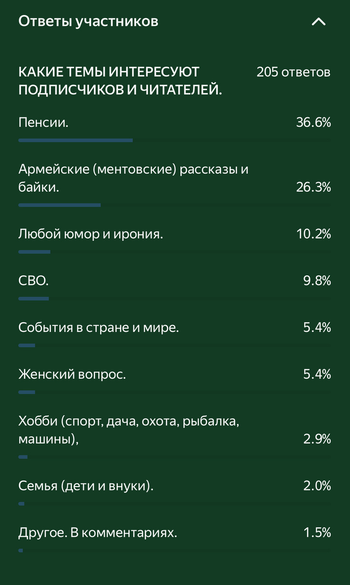 100% [о Бакуте]. А о ком ещё [писать]? Канал на нём держится. Если бы не Бакута, читали бы сейчас, какой будет размер пенсии через 5 лет. Написал Алексей, отвечая Анатолию Владимировичу в теме: Пришлось ответить с дополнением здесь: Насчет канала? Так всё руки не поднимаются бросить его! Ибо никакого смысла, когда Дзен перешел в руки местных, типа ВК, вести его нет! А по писанию, сотни моих баек гуляют по сети. И размещать их здесь на канале не очень хочется. А писать новые, замыслов много, а желания мало. А товарищ Александр Бакута, Комсомолец и другие товарищи подписчики своими историями поддерживают жизнь канала. И спасибо им. И теперь по пенсиям, в увлечении которыми вы и некоторые другие подписчики постоянно упрекаете меня. Недавно я задал вопрос: Какие темы интересуют подписчиков и читателей канала "Политически несерьезно". Ответов, правда, всего на две роты численностью наберется. Это раньше, когда Яндекс Дзен был, то в таких темах ответов набиралось от многих сотен до многих