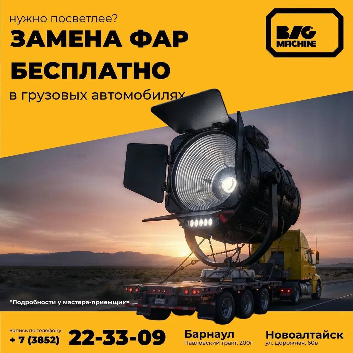 🚛 БЕСПЛАТНАЯ замена фар в грузовых автомобилях Хороший свет — это безопасность, уверенность на трассе и меньше усталости в ночных рейсах. ✅ Чёткий и яркий свет ✅ Лучшая видимость в дождь и снег ✅ Безопаснее на трассе и в городе ✅ Работы выполняют профессионалы 🔧 Подробности — у мастера-приёмщика 📞 +7 (3852) 22-33-09 Ждем вас по адресам: 📍 г. Барнаул, Павловский тракт, 200г 📍 г. Барнаул, Северный Власихинский пр, 67 📍 г. Новоалтайск, ул. Дорожная, 60в