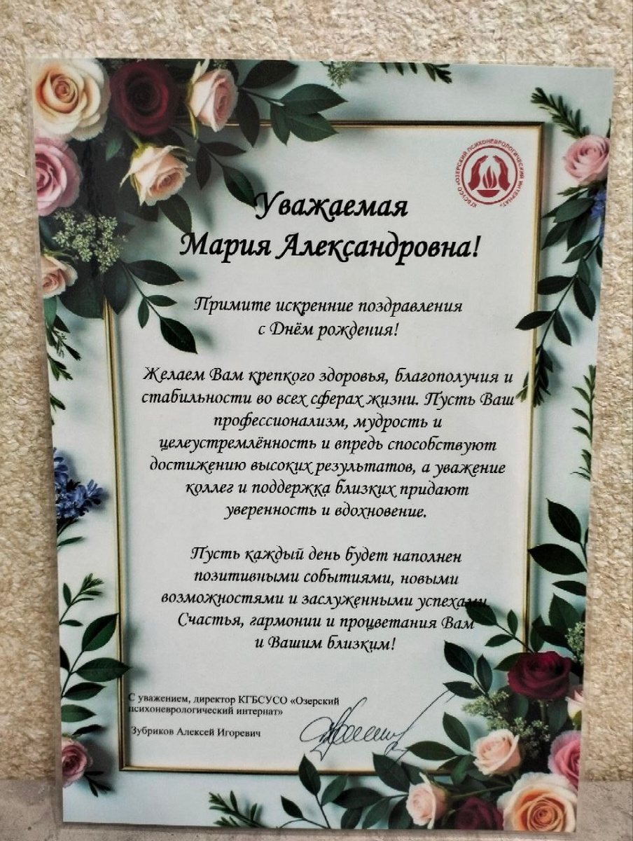 !✨ 👩💼Мария Александровна — настоящий профессионал своего дела, обладающий искренним состраданием и заботой о каждом пациенте. Её внимательность, доброта и желание помочь делают наш интернат теплее и уютнее. Мы благодарны за её труд, чуткость и поддержку в работе.🌟 💐В этот особенный день мы хотим пожелать Марии Александровне здоровья, счастья, вдохновения и всех благ, которые только можно пожелать. Пусть каждый новый день будет полон радости и улыбок, а рядом будут только верные друзья и родные люди!🌺 #ОзерскийПНИ #Юбилей