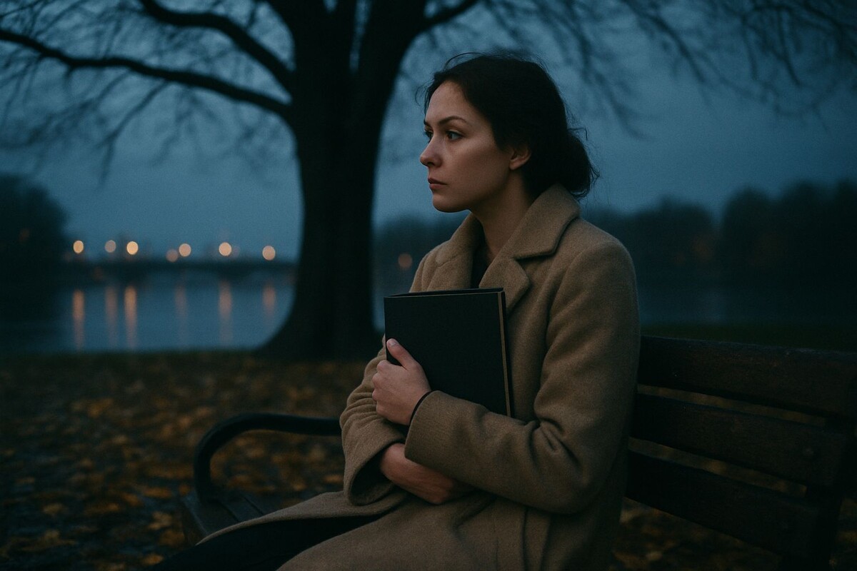 Он замедлил шаг. Она сидела, сгорбившись, в лёгком пальто, руки глубоко в карманах. В свете дальнего фонаря он разглядел её профиль: прямой нос, подбородок, приподнятый к небу. Она не плакала. Она просто смотрела на тёмную ленту реки.